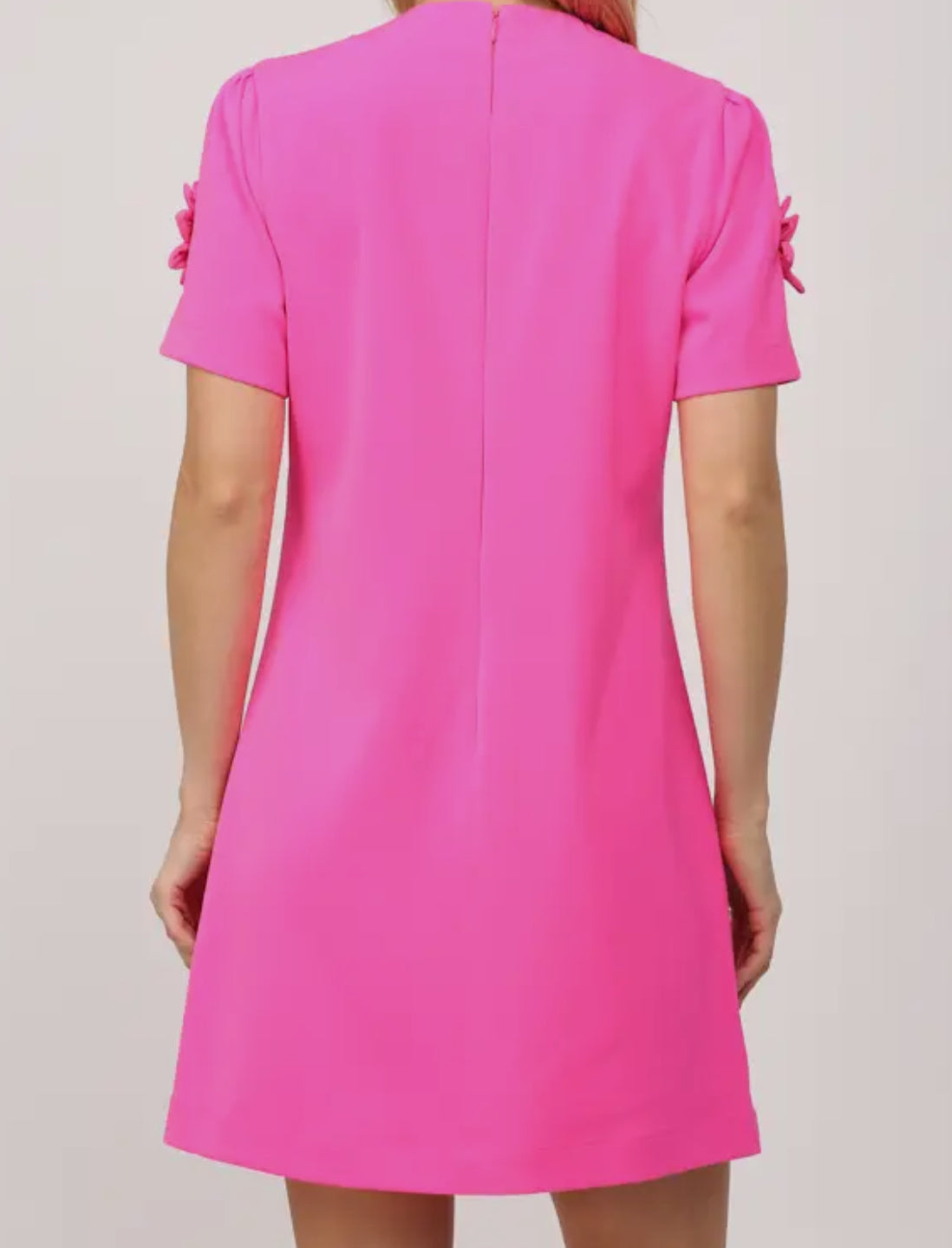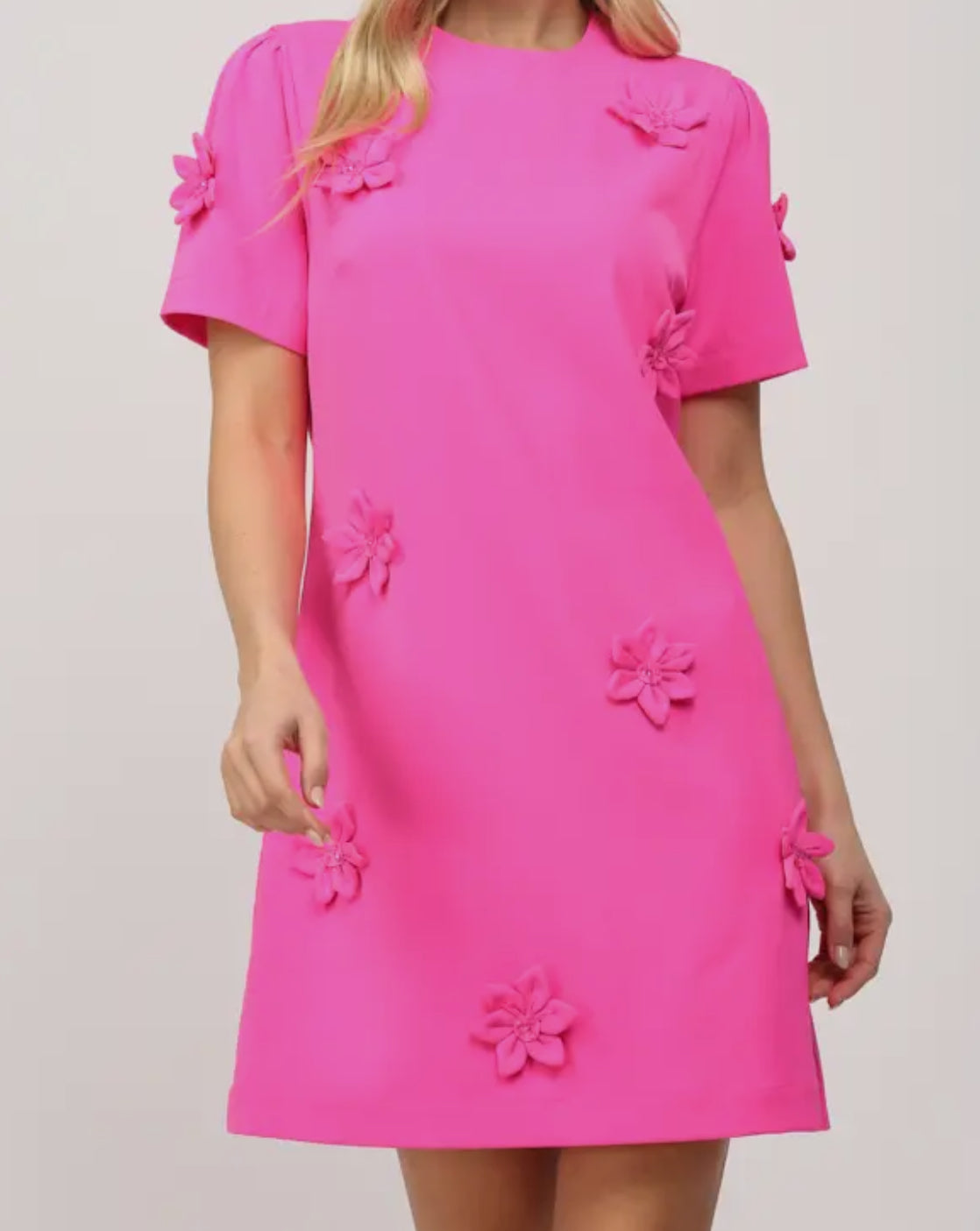 This hot pink shift dress features a stunning 3D floral corsage detail, adding a touch of elegance to your wardrobe. With its vibrant color and intricate design, this dress is perfect for any special occasion. Elevate your style with this beautiful and eye-catching piece.