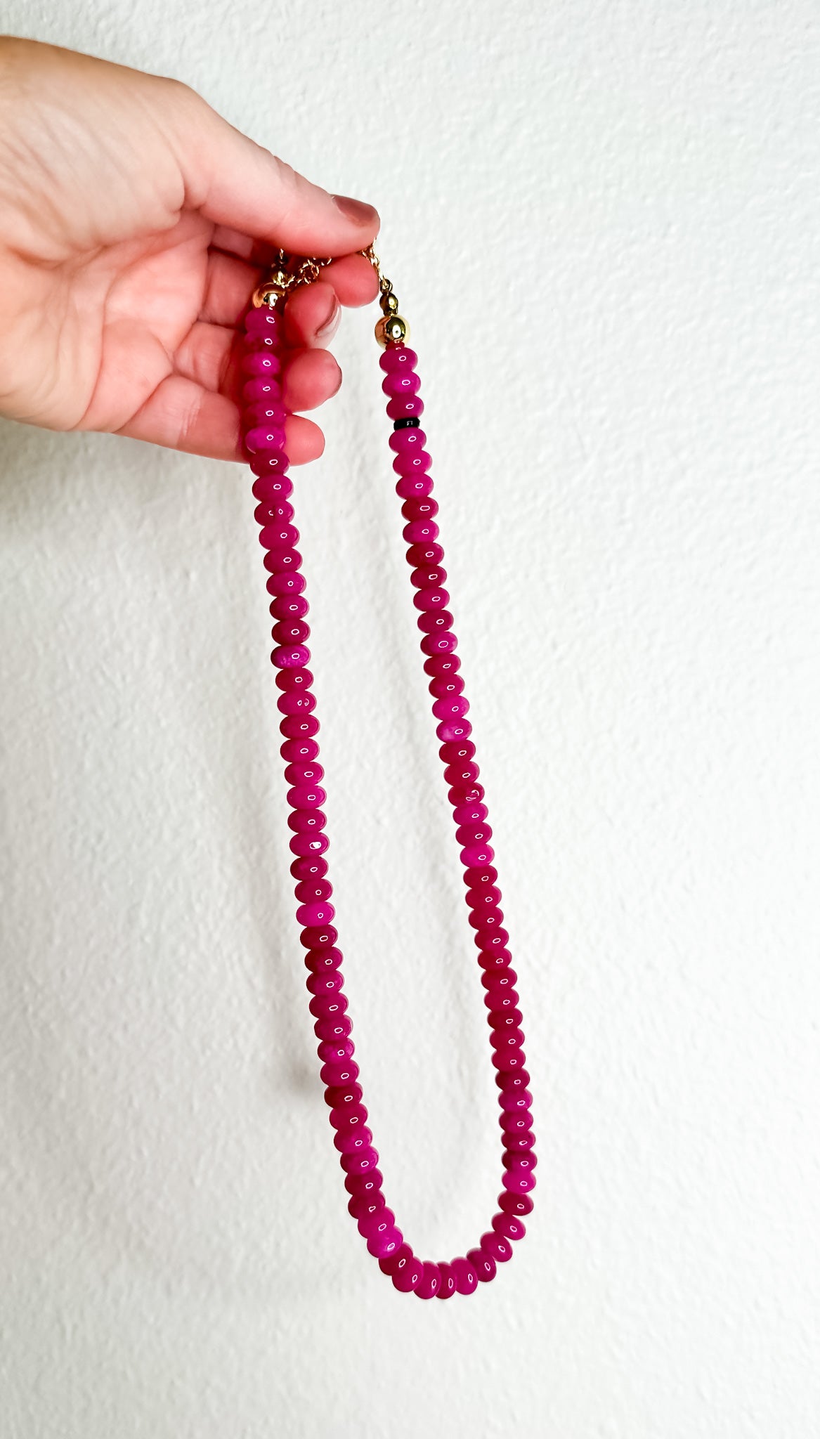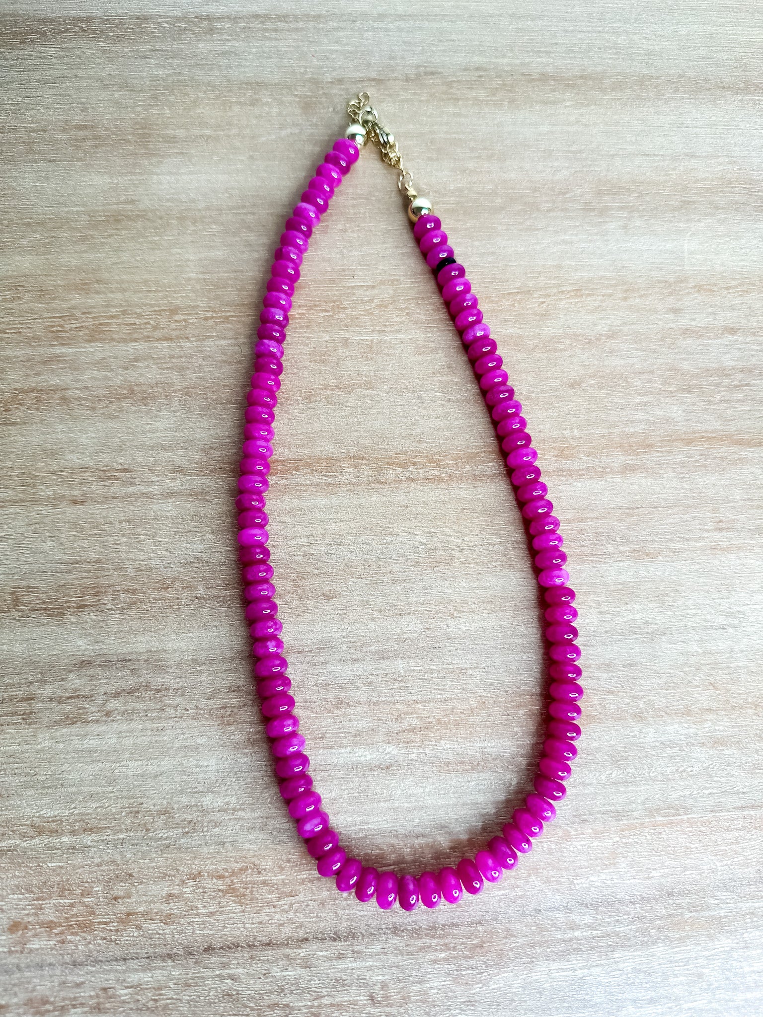 This 'Allie + Bess Magenta Necklace' is sure to liven up any outfit with its vibrant magenta beads! Make a statement with this stunning piece that won't soon be forgotten - the perfect accessory for any fashionista's wardrobe!