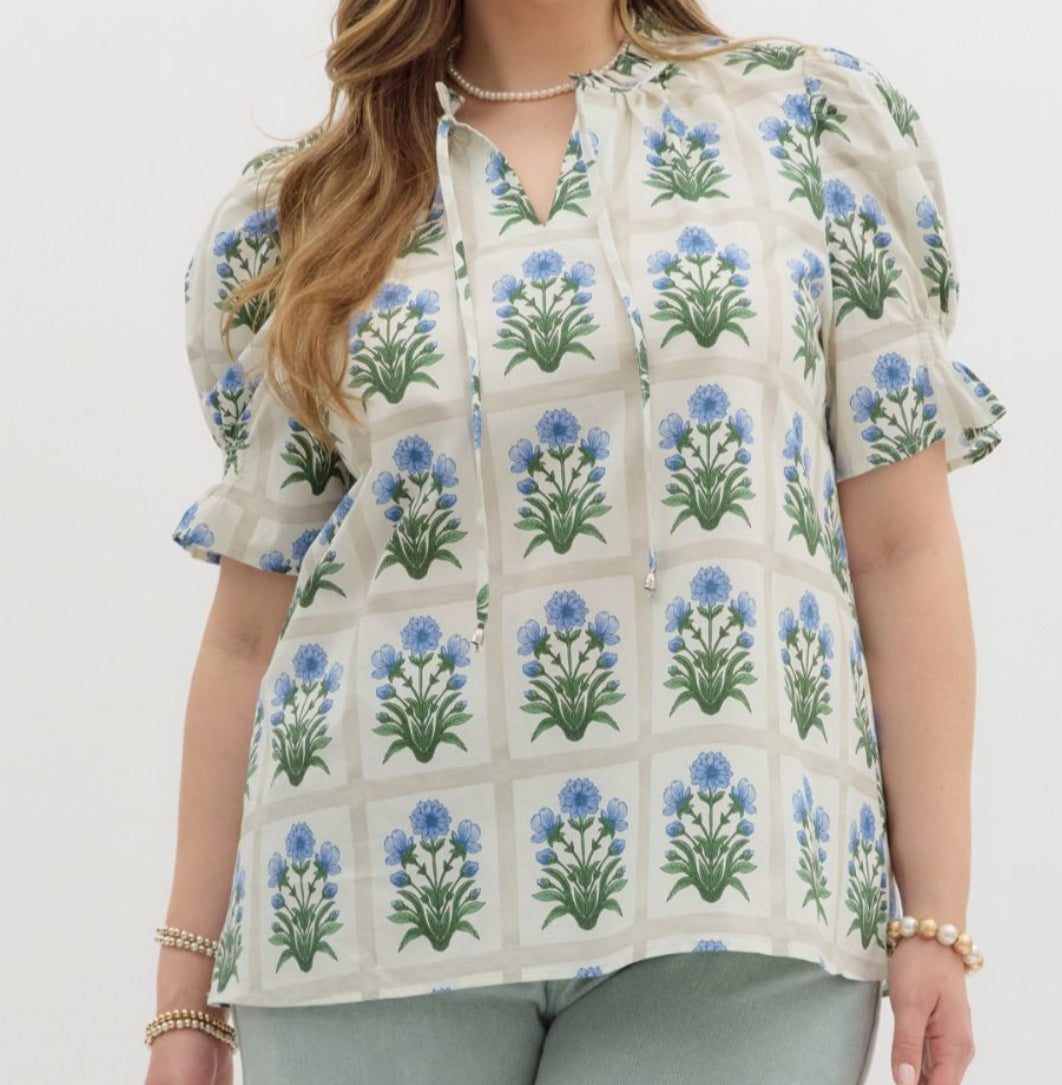 Experience the beauty of nature with our Botanical Breeze Blouse. This floral patterned top boasts a fashionable ruffle finish, perfect for adding a touch of femininity to your wardrobe. The outer smocked short sleeves provide both comfort and style. Elevate your look with this unique and versatile pullover top.