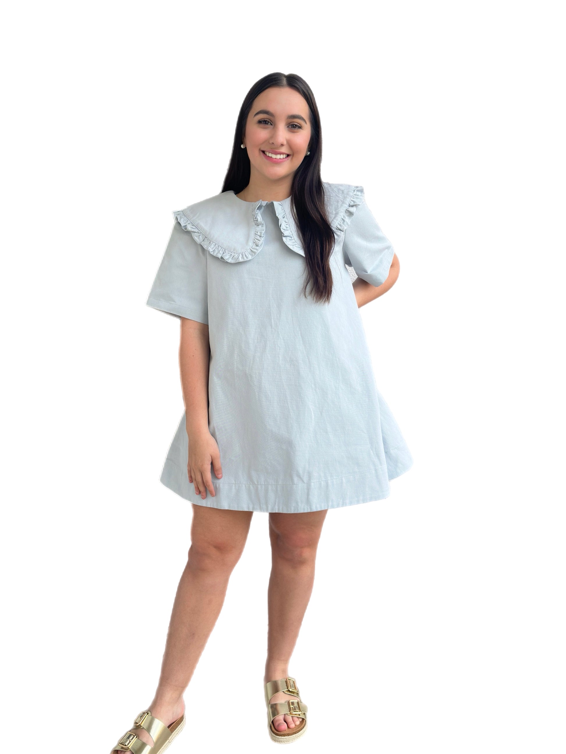 This light blue dress features a beautiful ruffle detail collar, adding a touch of chic to your brunch outfit. The perfect choice for standing out at any event, this adorable dress is a must-have for your wardrobe. Elevate your style and make a statement with the Brunch Babe Dress.