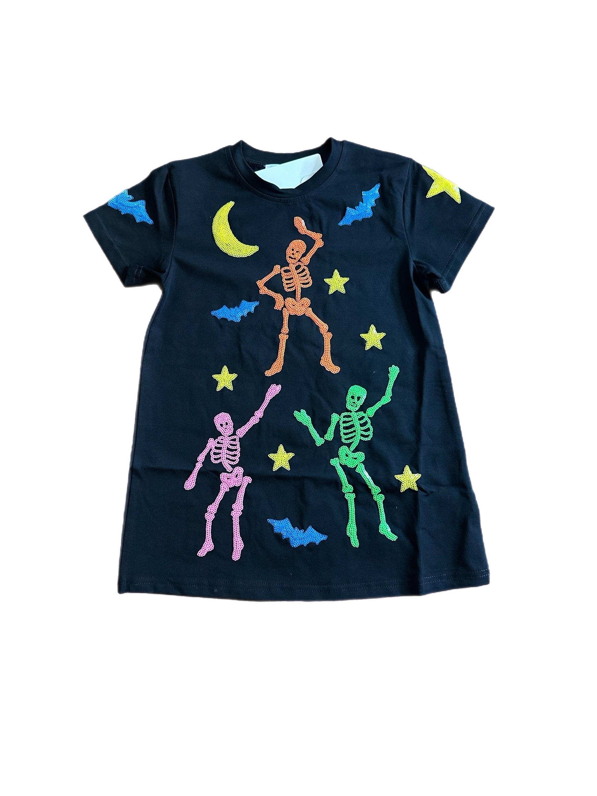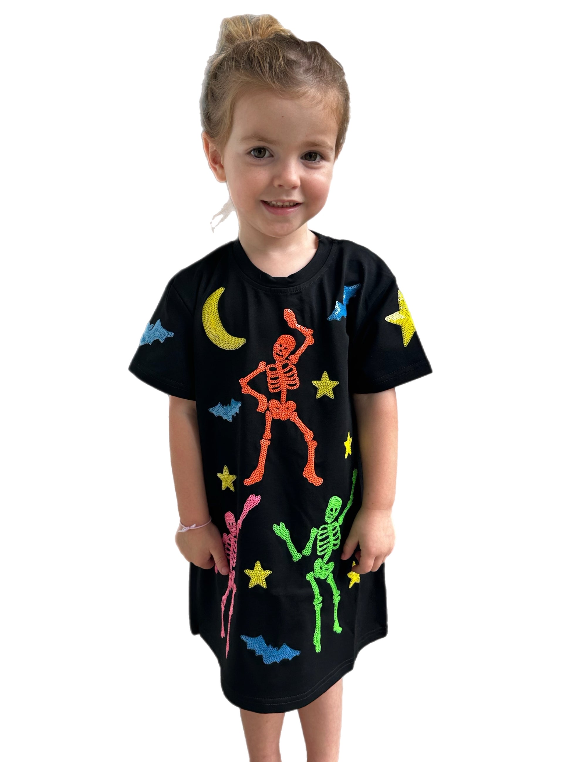 Dress your little one in spooky style with our Child's Black Skeleton Dress! This adorable sparkle dress is a must-have for any Halloween celebration. With its comfortable fit and eye-catching design, your child will be the star of the night. Perfect for any festive occasion, this dress is sure to make a statement.