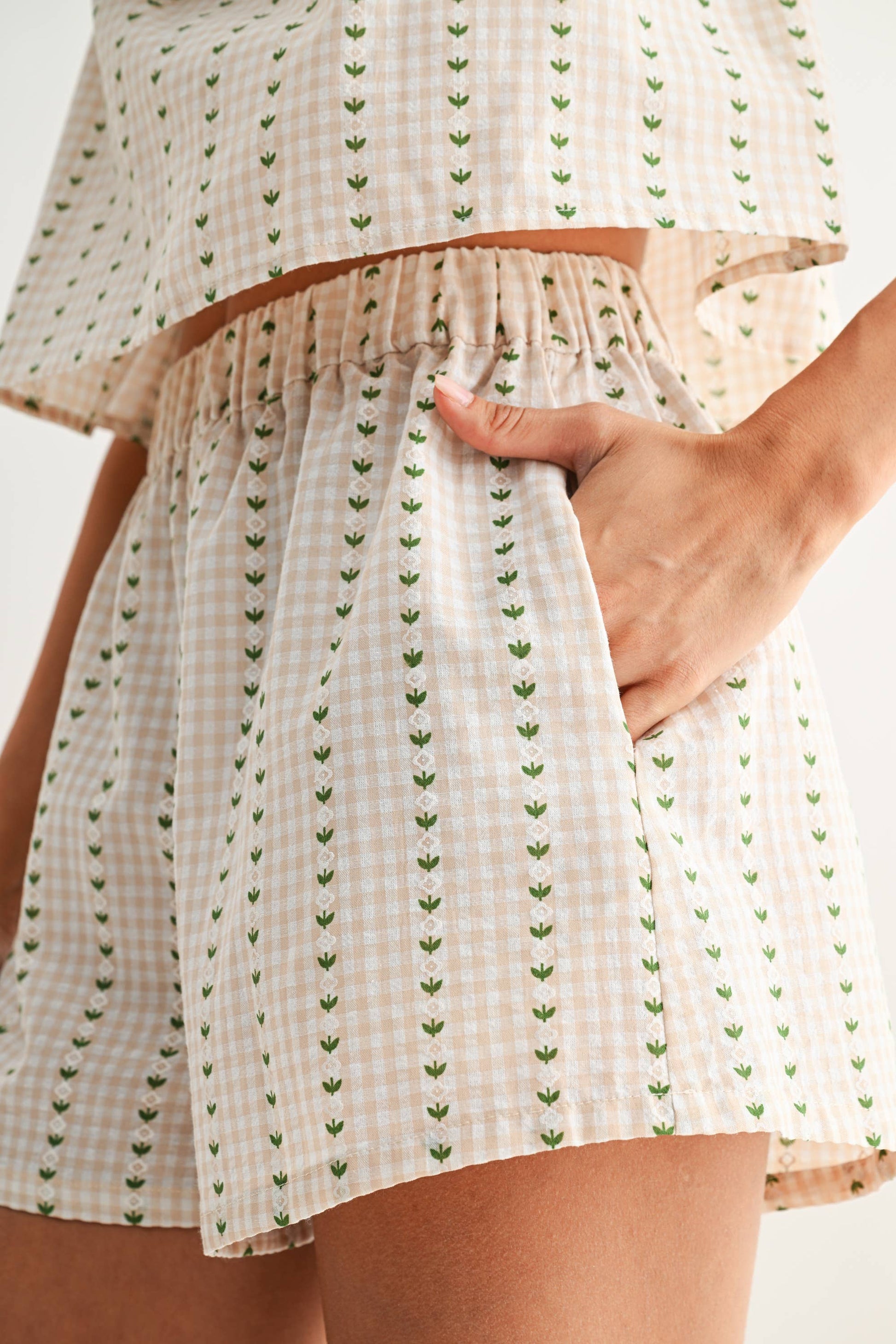 Elevate your warm-weather wardrobe with this sophisticated two-piece set, thoughtfully designed to bring effortless charm to contemporary lifestyles. The ensemble features a delicately patterned gingham fabric, accented with subtle green print details for added refinement. The sleeveless, tie-front top is complemented by matching high-waisted shorts, creating a coordinated look that is both chic and comfortable.