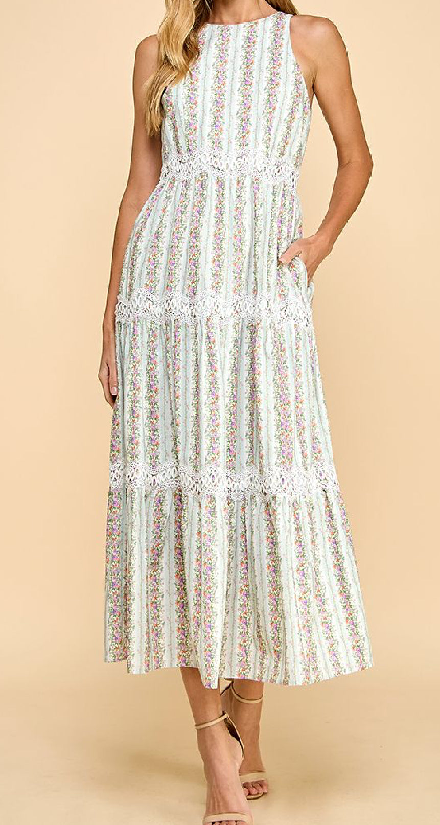 This sleeveless midi dress is perfect for any occasion with its elegant floral stripe print and delicate scallop lace inserts. The hidden zipper and full lining make it comfortable and easy to wear. Elevate your style with this floral and fancy dress.
