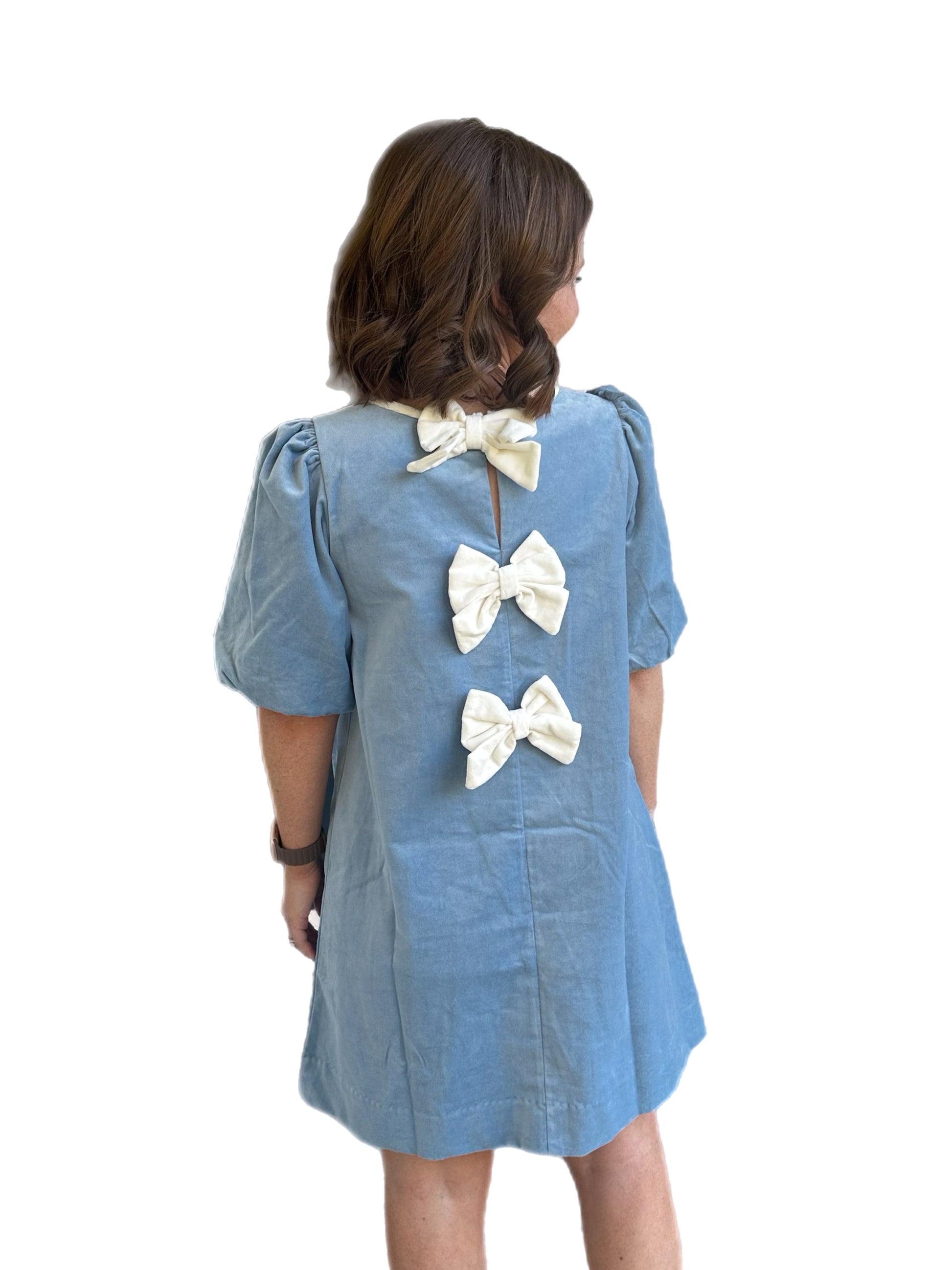 This Hallie Dress is the perfect addition to your tween's wardrobe. Made from beautiful blue velvet, it is adorned with delicate white bows on the back. The details and fit of this dress are both adorable and comfortable, allowing your little one to feel fabulous while wearing it. Add it to their collection today!
