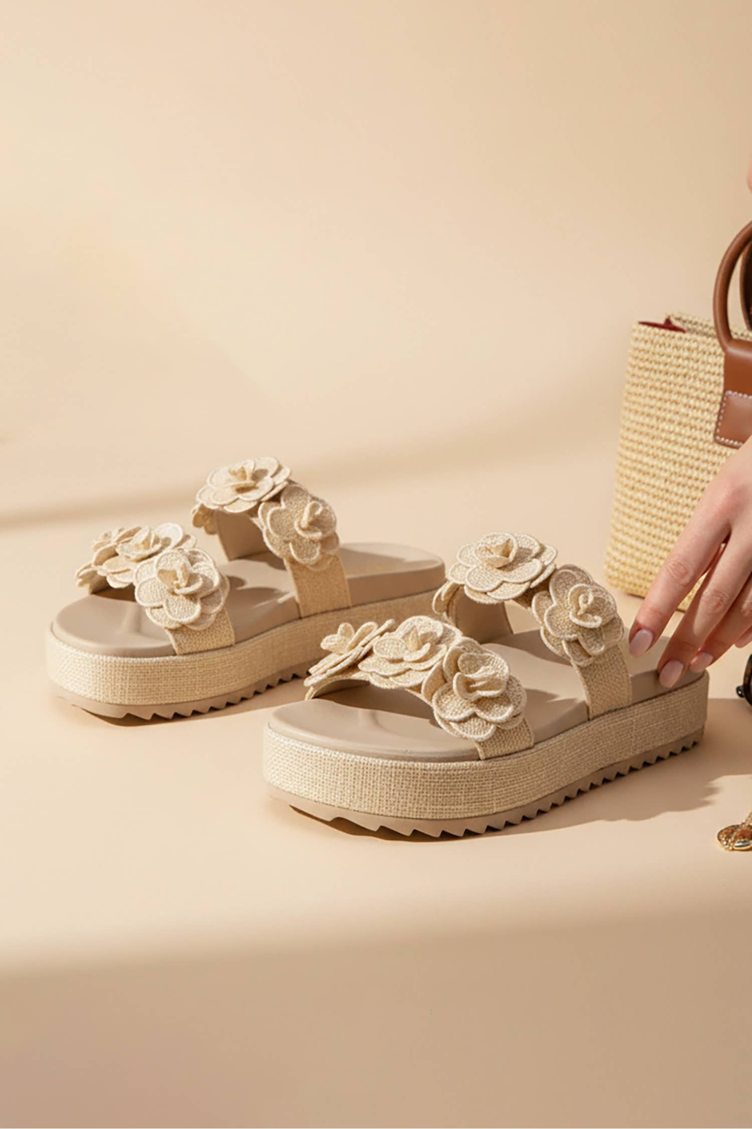 Meet your new everyday summer favorite. The Coastal Bloom Platform Sandals feature soft neutral woven straps adorned with delicate floral details that add the sweetest feminine touch. Designed with a lightweight platform sole and cushioned footbed, they’re just as comfortable as they are stylish. Pair them with dresses, denim, or your favorite casual set for an effortless warm-weather look.