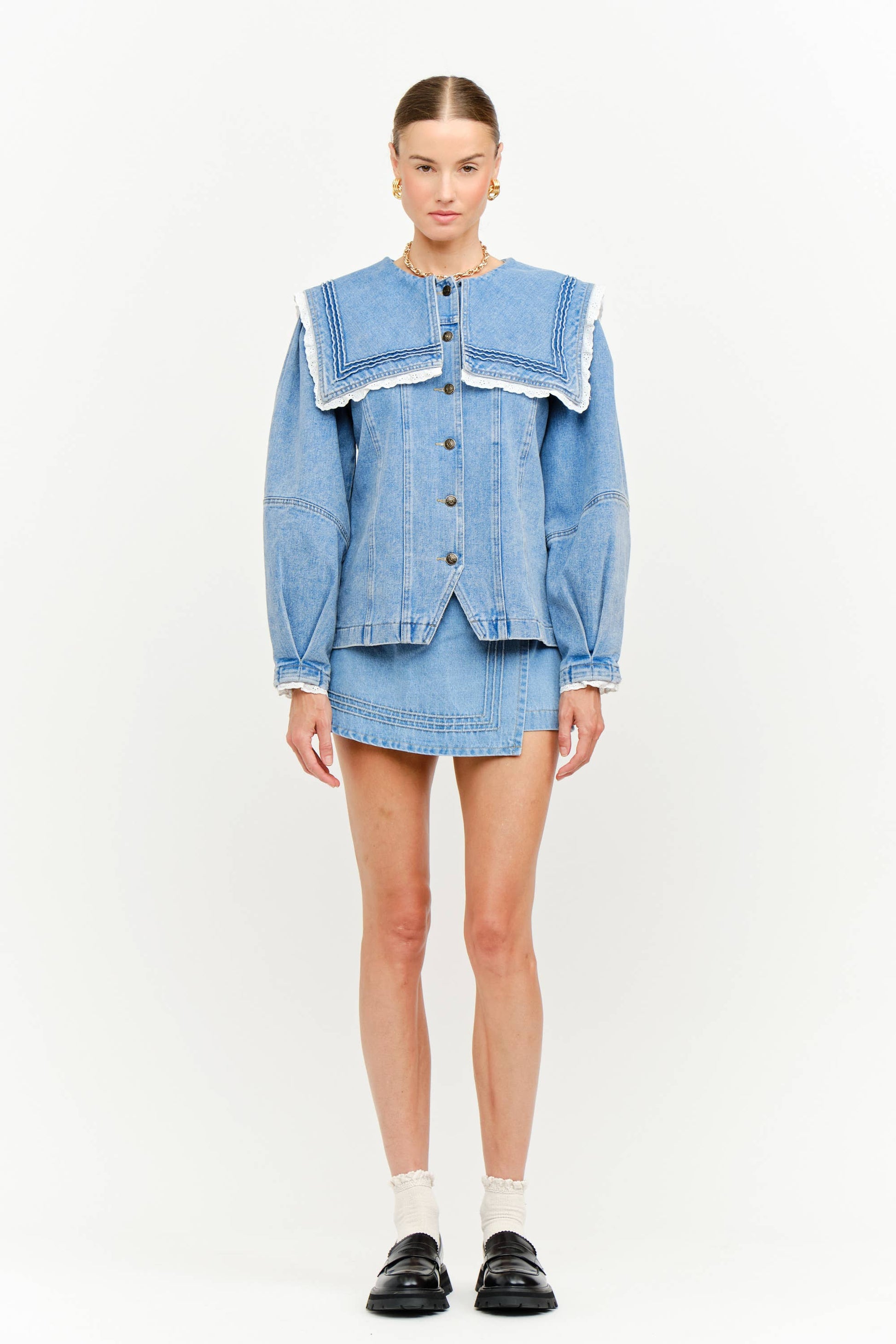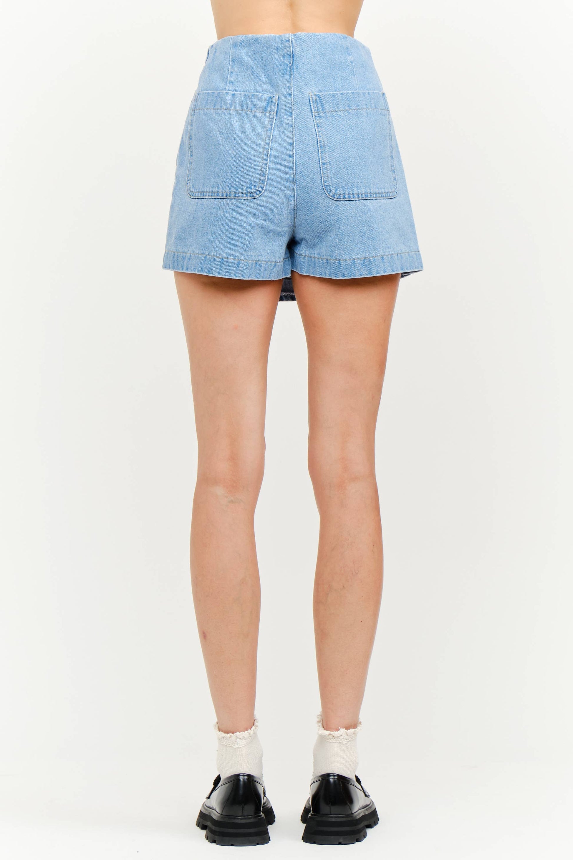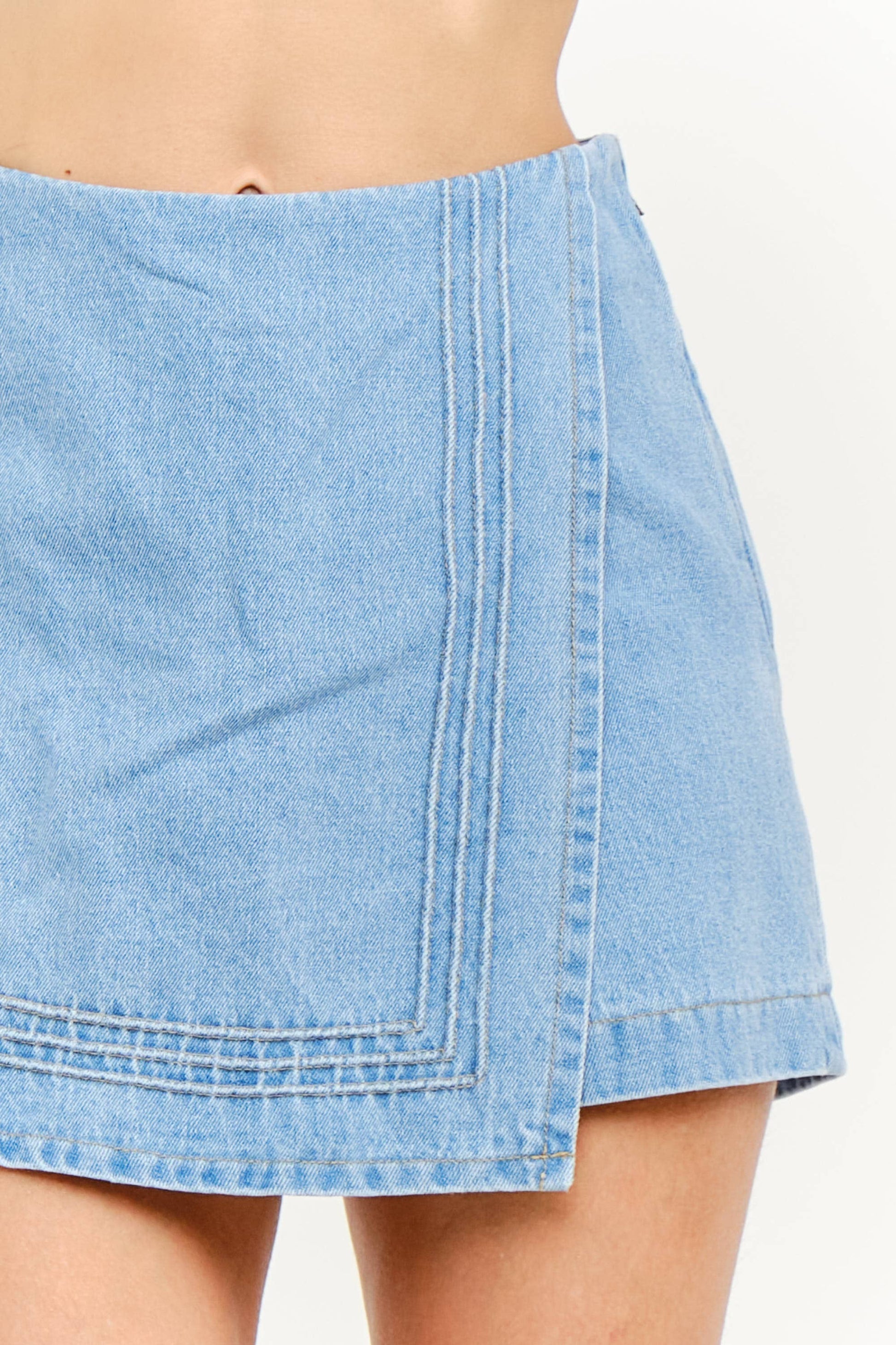 The Maggie Skort features a faux-wrap design and a light wash denim, combining style and practicality. This mini skirt offers a versatile option for casual wear, with the added benefit of comfort and ease of movement, making it suitable for various daily activities.