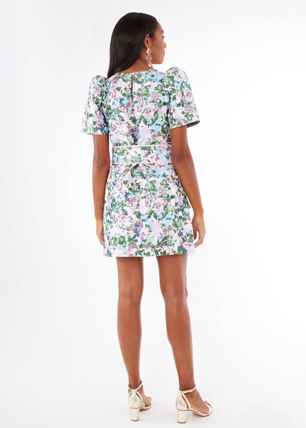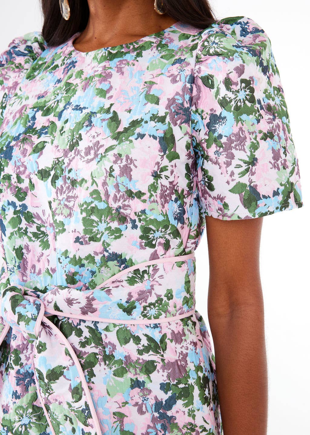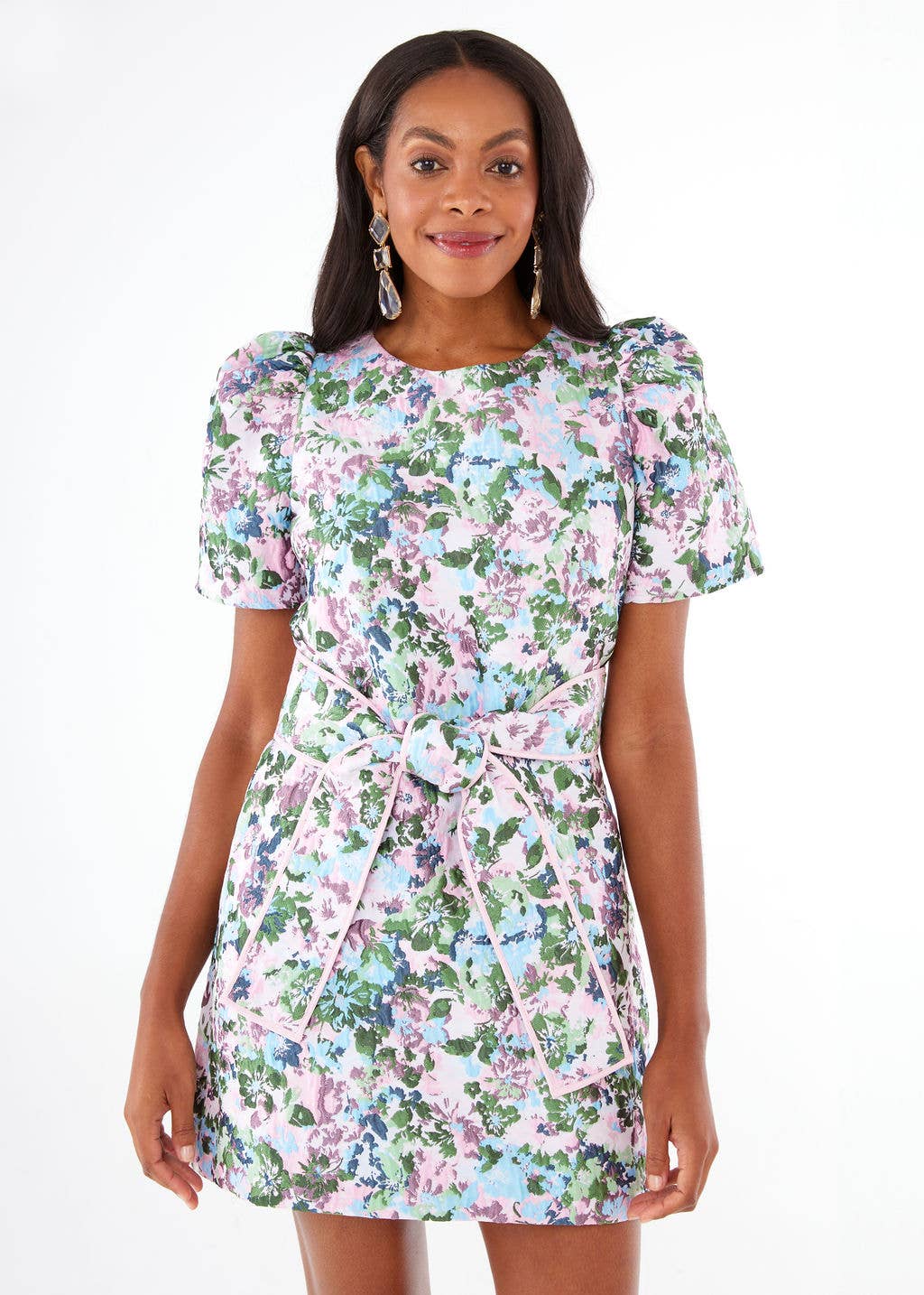 The Marty Dress by Abbey Glass is a must-have for any fashion-forward individual. With its true-to-size fit and detachable belt, it offers both comfort and versatility. Made from pink abstract floral jacquard, this dress exudes high-quality and stunning beauty. Elevate your wardrobe with this gorgeous piece.