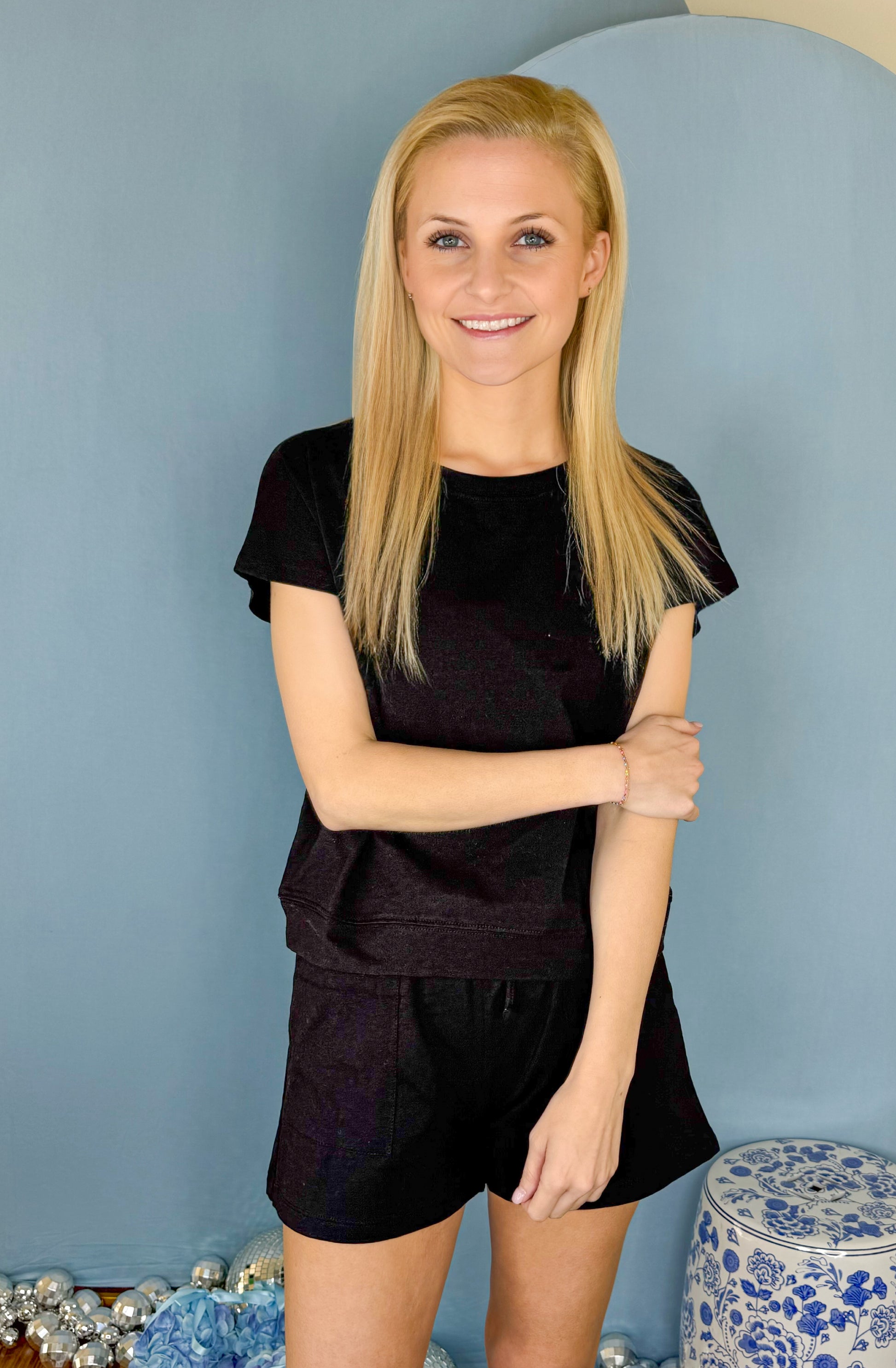 The tee has an easy, slightly relaxed fit, while the pull-on shorts feature an adjustable waist and functional side pockets (because comfort should still be practical). The classic black makes it endlessly versatile — wear it as a set or mix and match with your favorite basics.