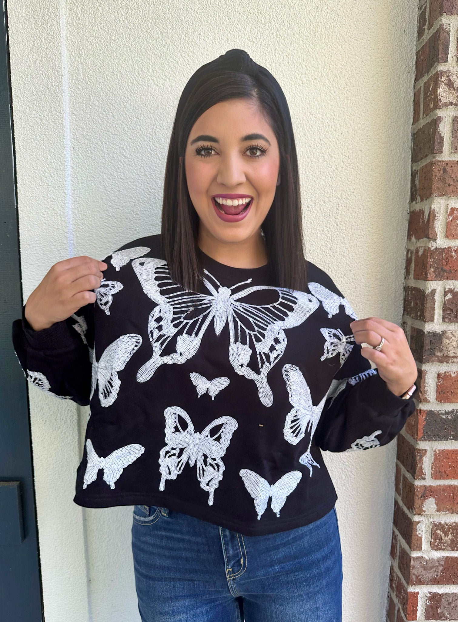 Make a statement with this QOS Butterfly Skeleton Crop Sweatshirt! It's perfect for adding a touch of spooky fun to Halloween, or for expressing your love of butterflies year-round. Featuring a black sweatshirt with white sparkling butterflies, be bold and stylish while staying comfy and warm. Let the world know your style!