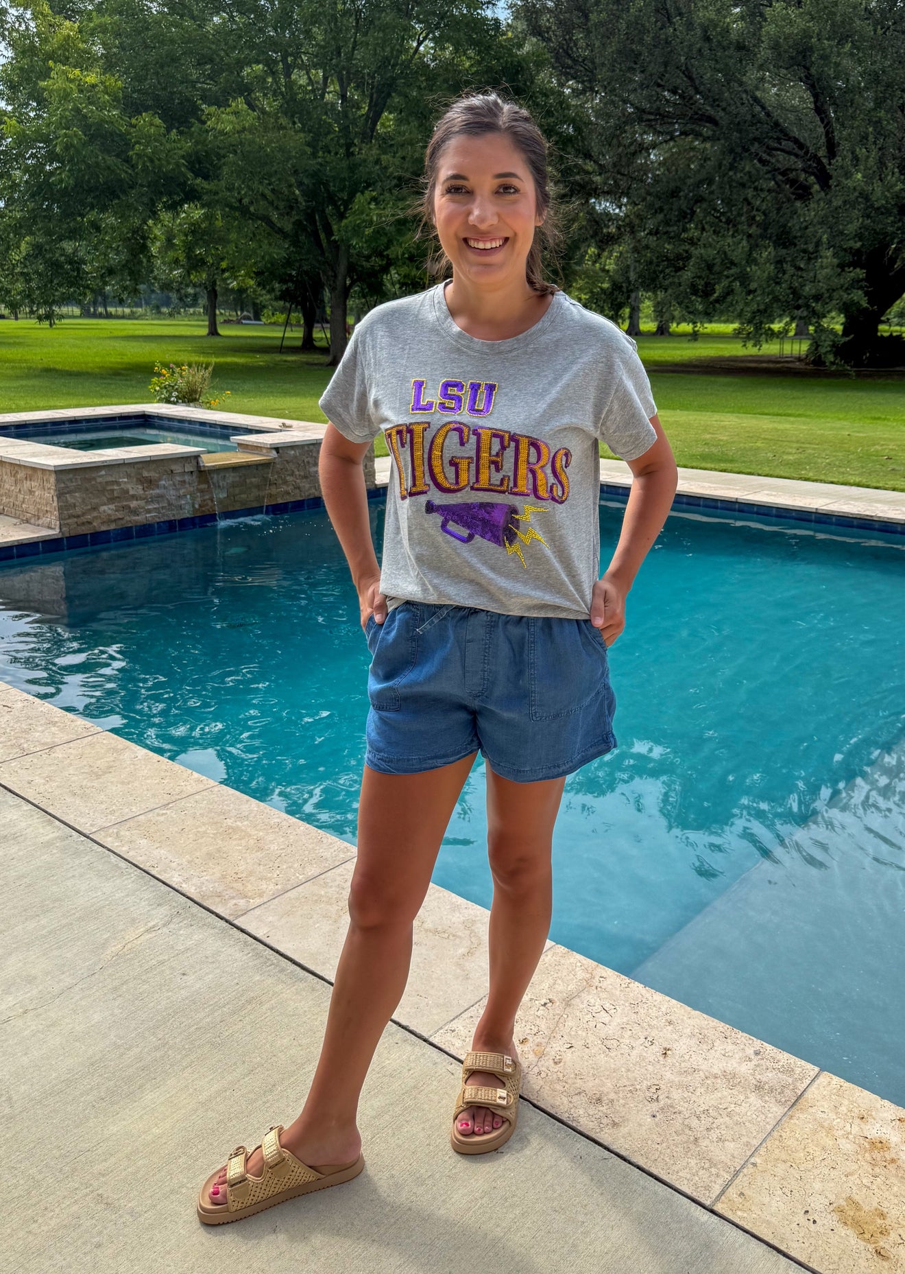 "Show your team spirit with our QOS Licensed LSU Megaphone and Icon Tee! This sparkly, sequined tee features a cute megaphone design. Perfect for cheering on your tigers in style. Go team!"