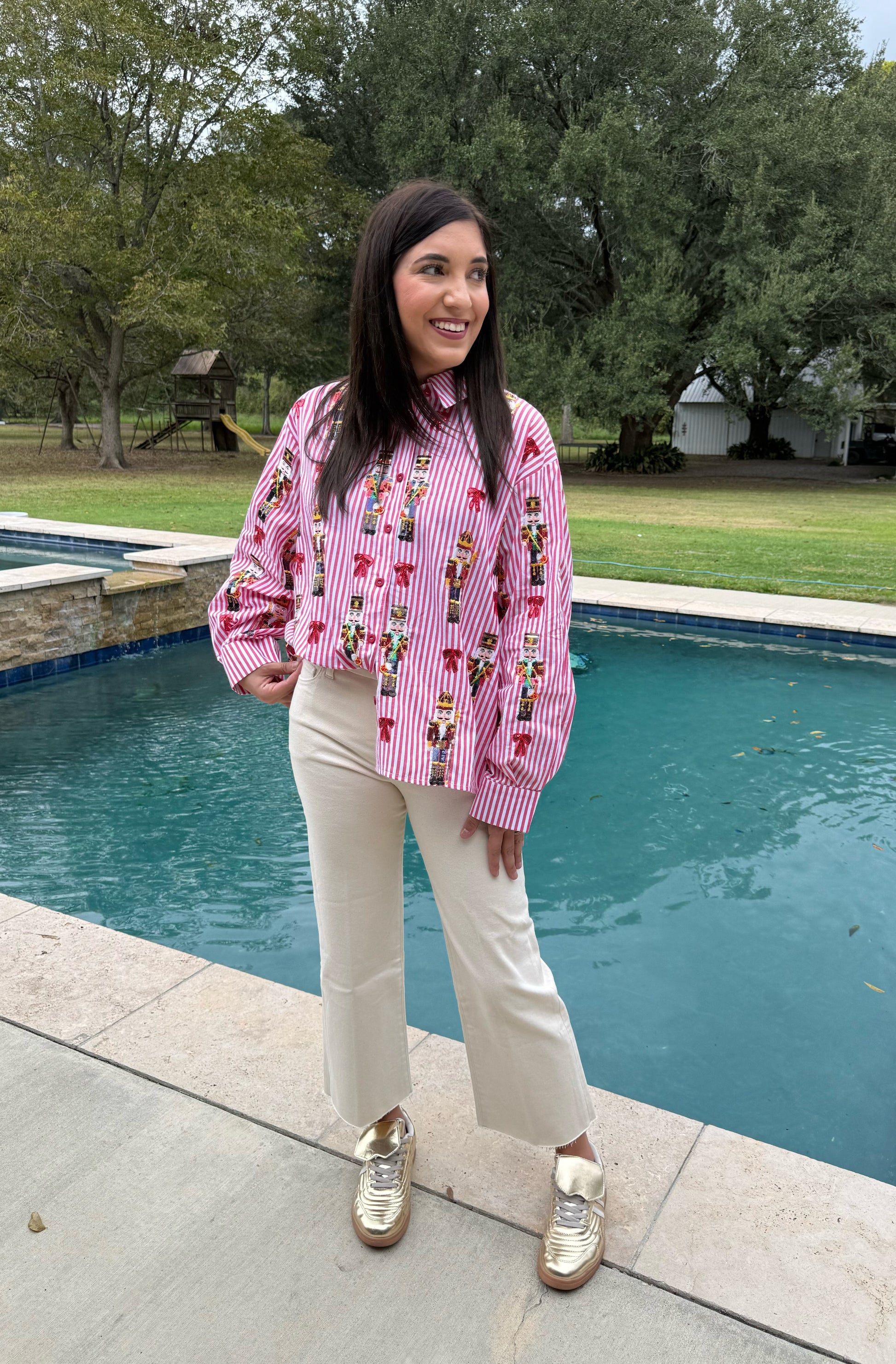 Introducing the QUEEN OF SPARKLES Red Stripe Scattered Nutcracker and Bow Button Down! Add a touch of festive cheer to your wardrobe with this top. Featuring a scattered nutcracker and bow design, this button down is the perfect addition to your holiday attire.