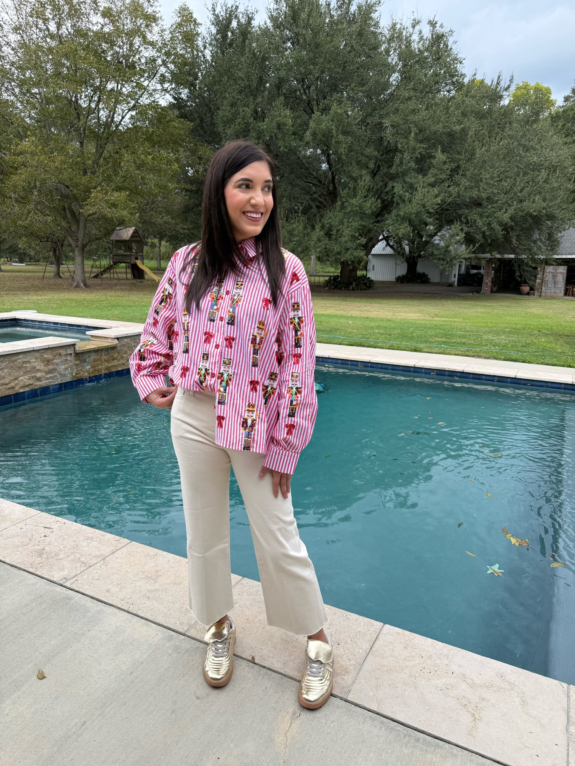QUEEN OF SPARKLES Red Stripe Scattered Nutcracker and Bow Button Down
