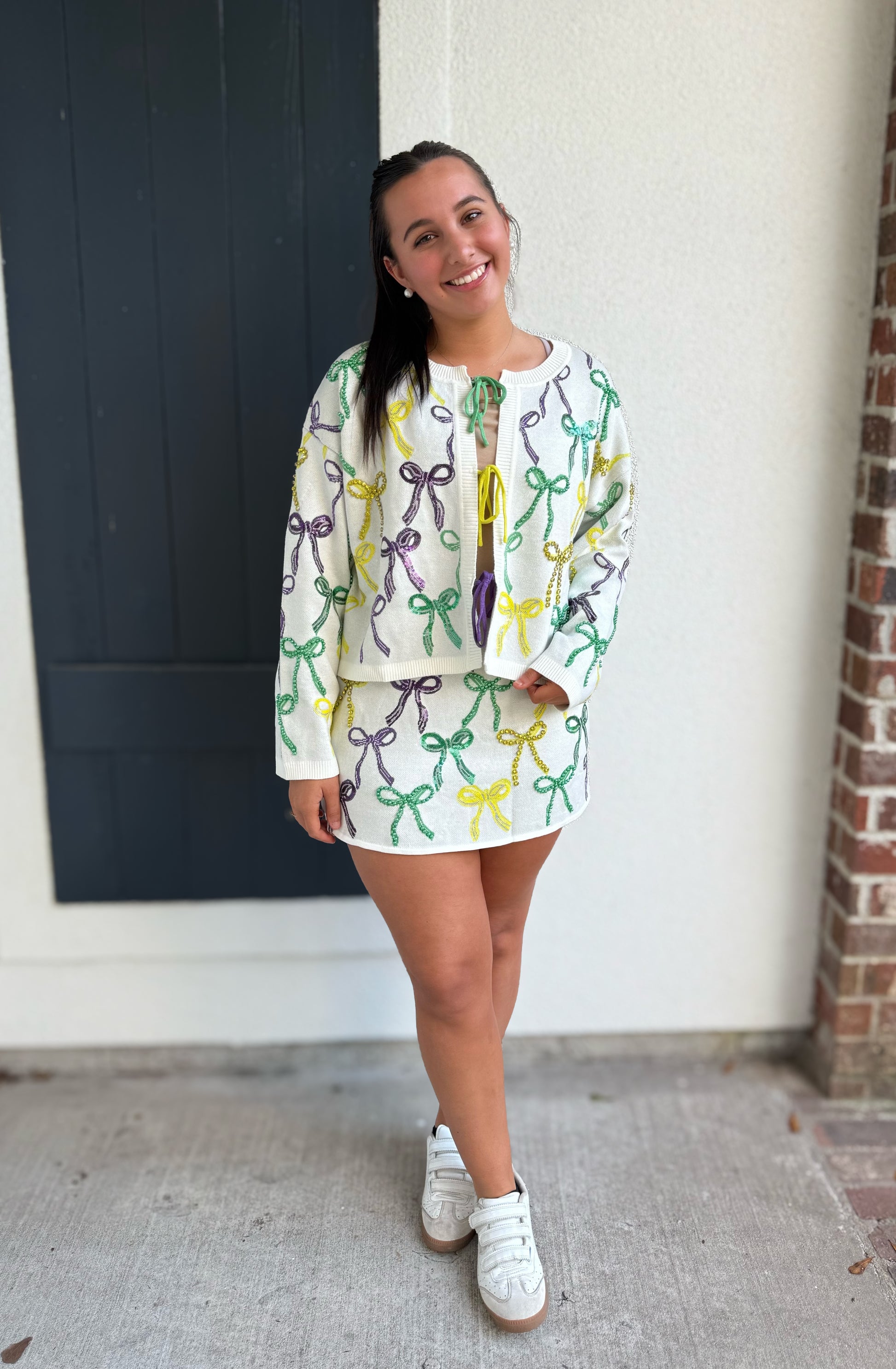 Complete the look with this Queen of Sparkles skirt, designed to bring playful sparkle to any outfit. This mini skirt features a soft, lightweight knit base adorned with an allover bow pattern in vibrant Mardi Gras–inspired colors, finished with shimmering sequins for added shine. Designed with a flattering, easy pull-on fit, it sits comfortably at the waist while offering just the right amount of stretch. Fun yet chic, this skirt pairs perfectly with the matching sweater top or a simple neutral for a standout, festive look.