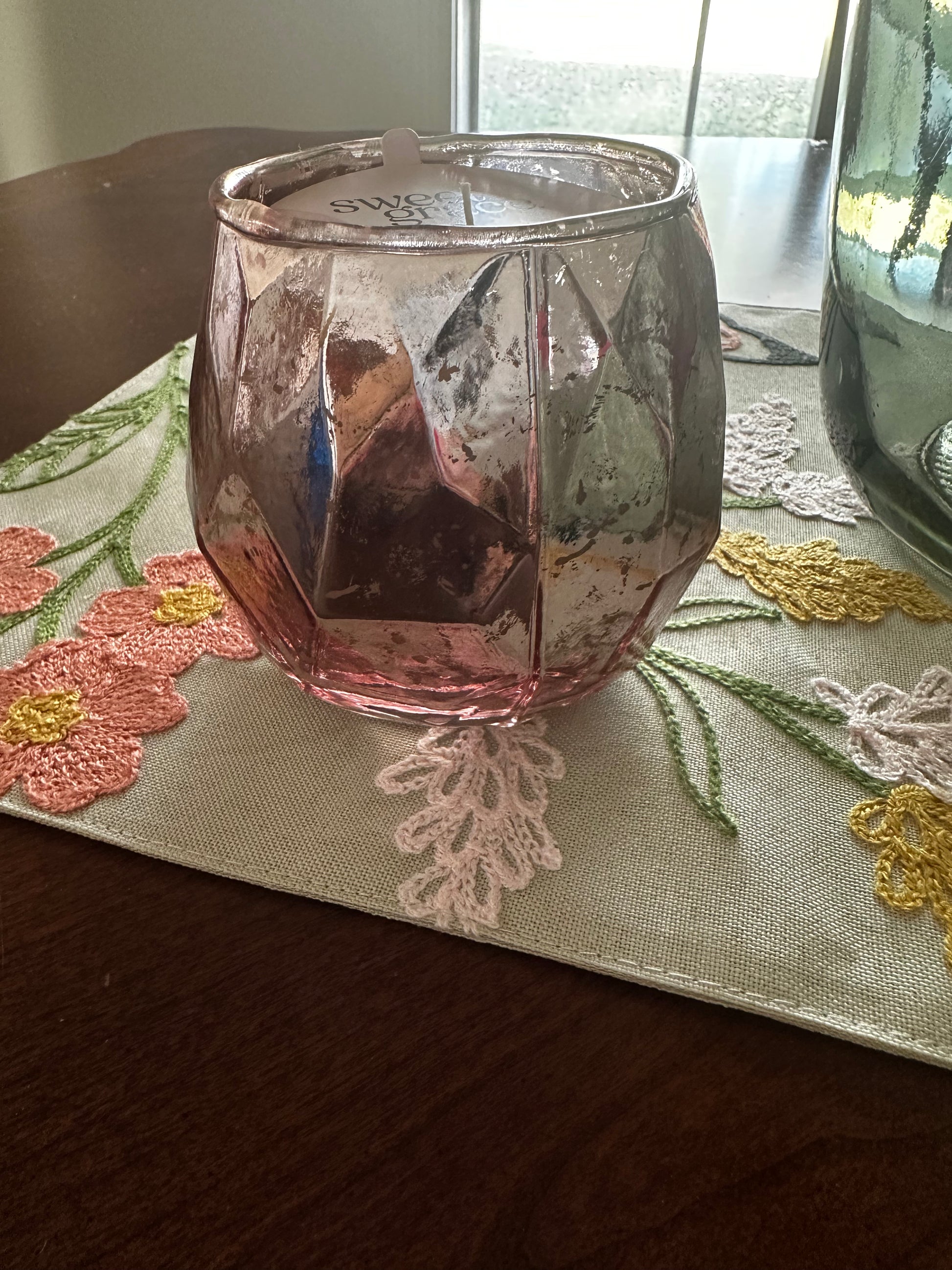 Introducing our Sweet Grace Pink candle, encased in a stunning pink mercury glass vase. The perfect addition to your home decor, this candle boasts a delicate and comforting scent, bringing a sense of peace and calm to any space. Elevate your ambience with Sweet Grace.