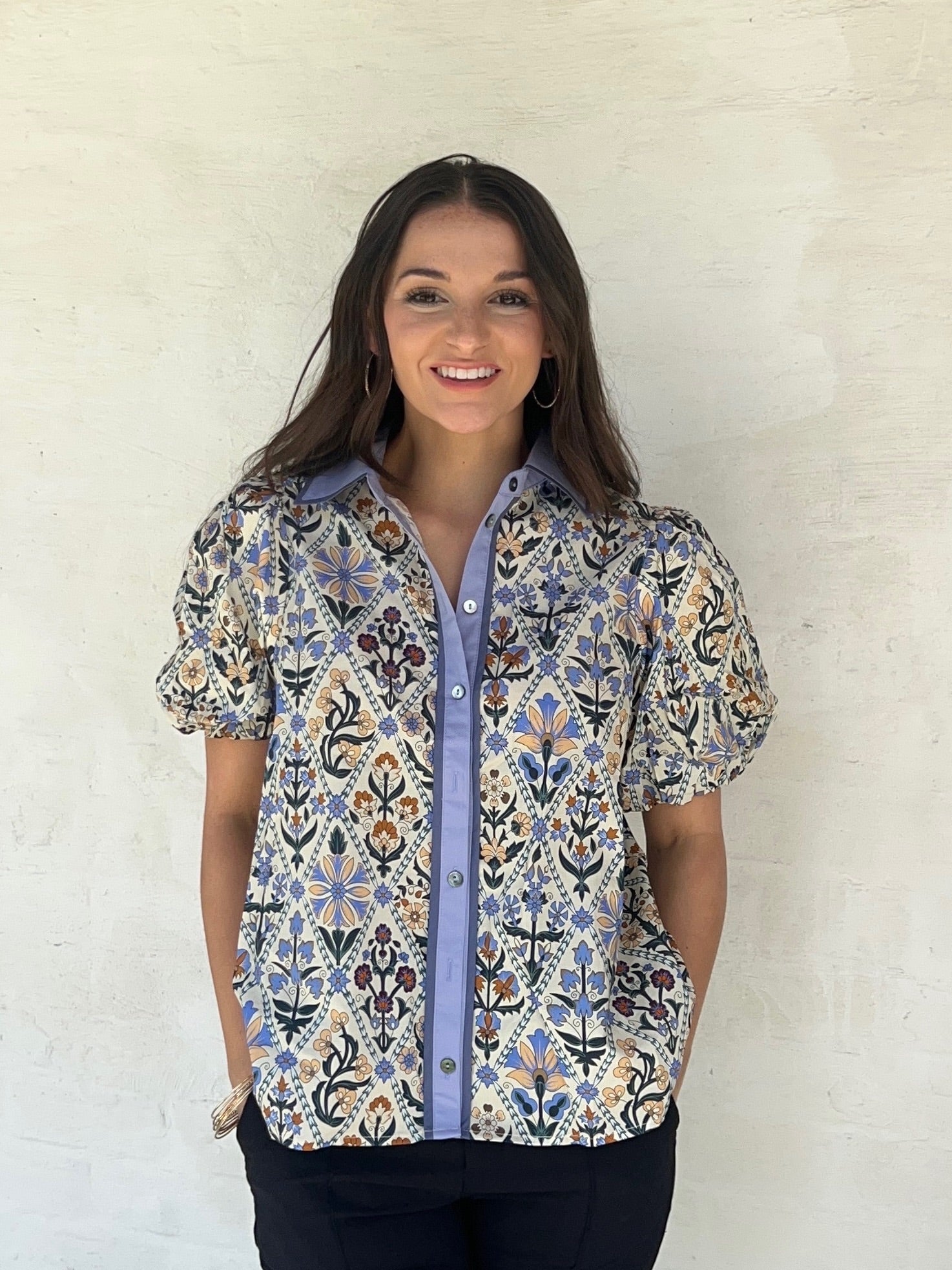 Elevate your wardrobe with our charming Garden Trellis Top. With intricate floral and vine motifs arranged in a diamond pattern, this puff-sleeve button-down is both classic and playful. The soft lavender accents and gathered sleeves add feminine touches, making it versatile for work or weekend wear. πΈ