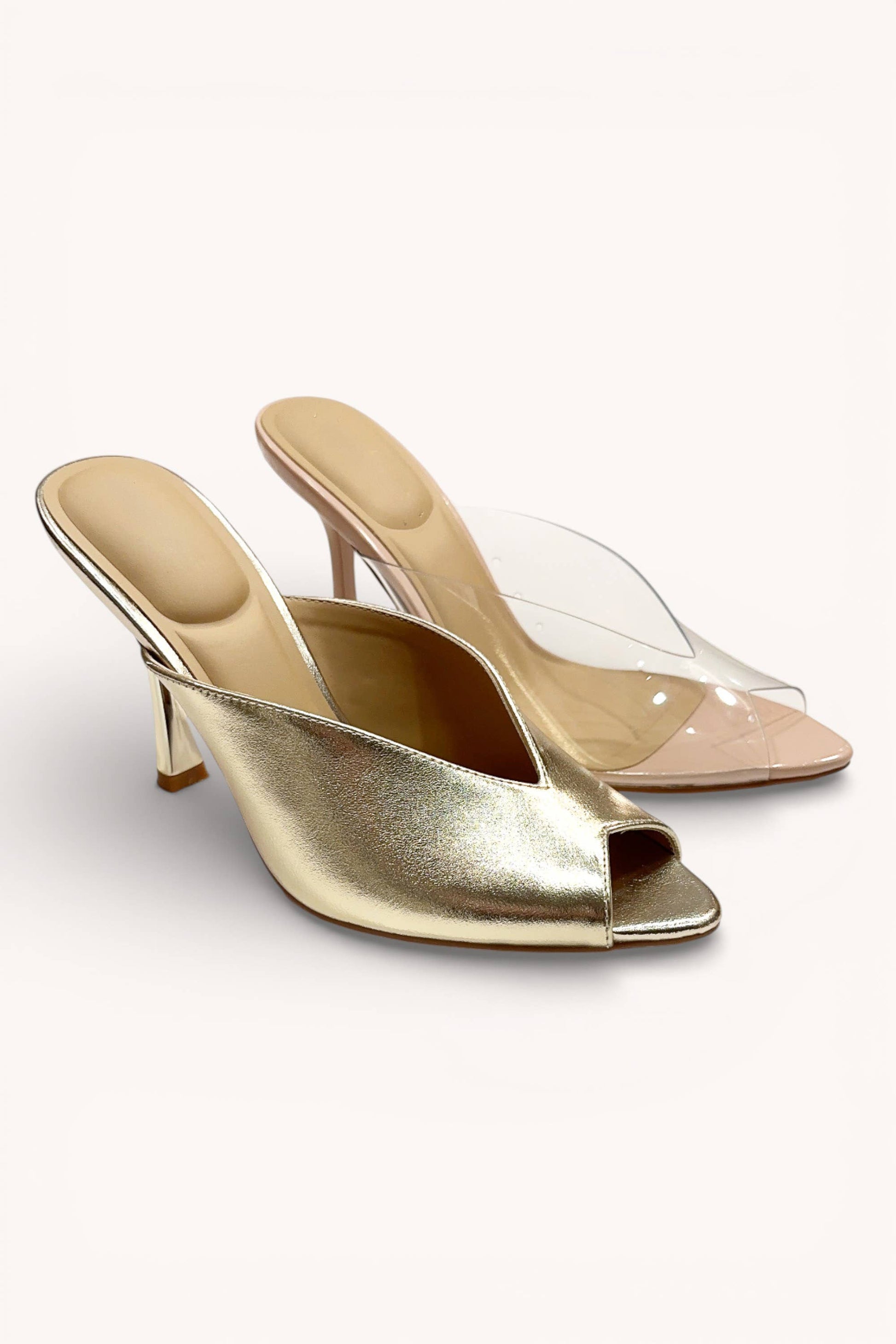 These are a pair of chic, metallic gold mule heels with a sleek, modern vibe. They feature a soft square open toe and a smooth, glossy finish that catches the light beautifully. The upper has a structured, slightly folded design that gives them an elevated, fashion-forward look, while the slip-on style makes them easy and effortless to wear. The mid-height block heel adds just enough lift while still keeping them comfortable and practical.