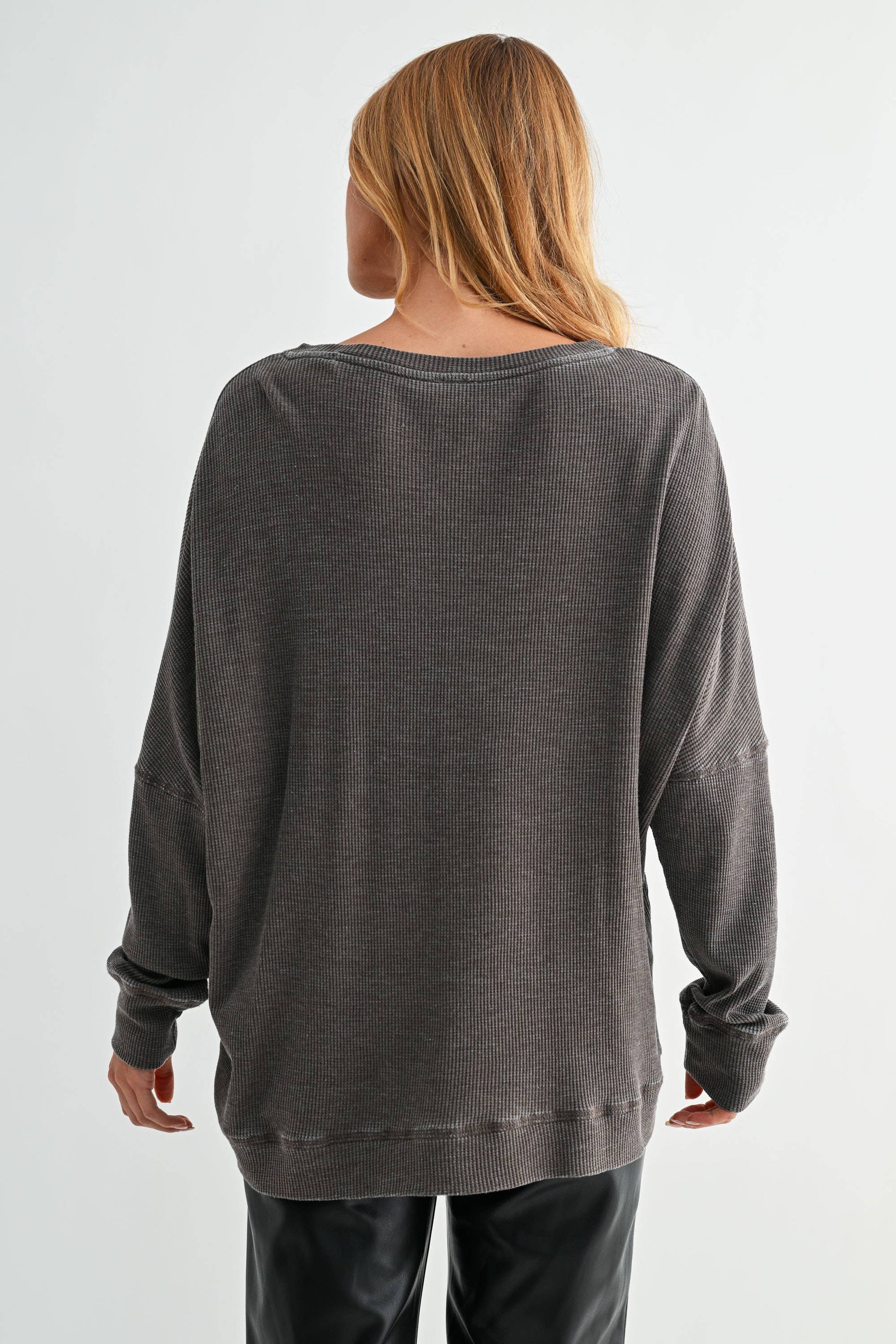 The Waffle Ribbed Roundneck Pullover is a must-have for any casual wardrobe. Its slouchy fit and rounded neck provide a relaxed look, while the ribbed texture adds versatility. The long sleeves, with seams wrapping around the elbow, add a unique touch. Plus, it's one size fits all.
